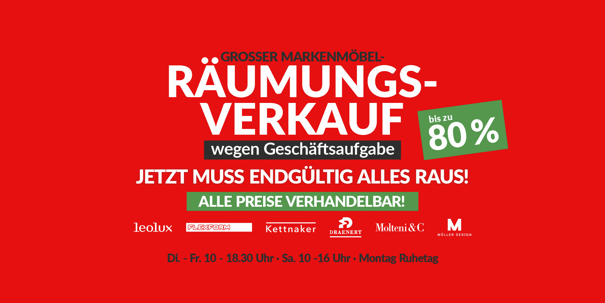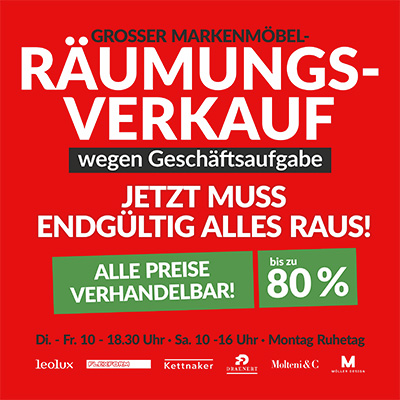 Nun heißt es für uns, Abschied zu nehmen und einen neuen Lebensabschnitt zu beginnen. Aktuell läuft bereits unser großer Markenmöbel-Räumungsverkauf. Nutzen Sie die einmalige Gelegenheit, jetzt hochwertige Polstermöbel, Esstische und Stühle, Polsterbetten, Kleiderschränke, Schrankwände, Sideboards sowie Leuchten zu besonders attraktiven Preisen zu entdecken. Ebenso eine große Auswahl handgeknüpfter Teppiche, „modern“ oder „klassisch“, in allen Maßen und Farben. Nur für kurze Zeit, schnell sein lohnt sich!
